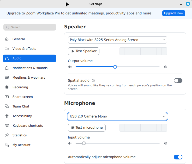Here's the zoom settings page, if you have two microphones, one from the webcam, another external, they should appear in the Microphone section and you can select which microphone to use. I have the option to use the webcam (usb 2.0 camera mono) mic or my headphones' (Poly 8225) mic.