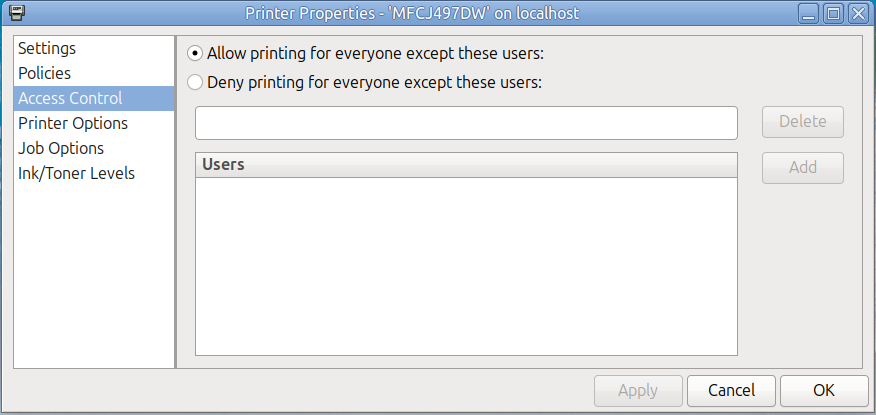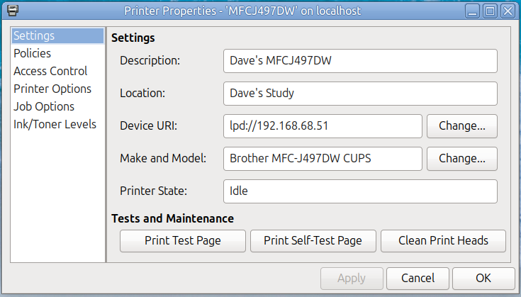 Could you please post a screenshot of the "Settings" pane of your "Printer Settings" dialog? My Brother printer is ink-jet rather than laser, but I recall that after following Brother's driver installation instructions, the printer would not respond. I eventually tried tweaking the URI in this dialog until it worked. Here's my screenshot, as an example: