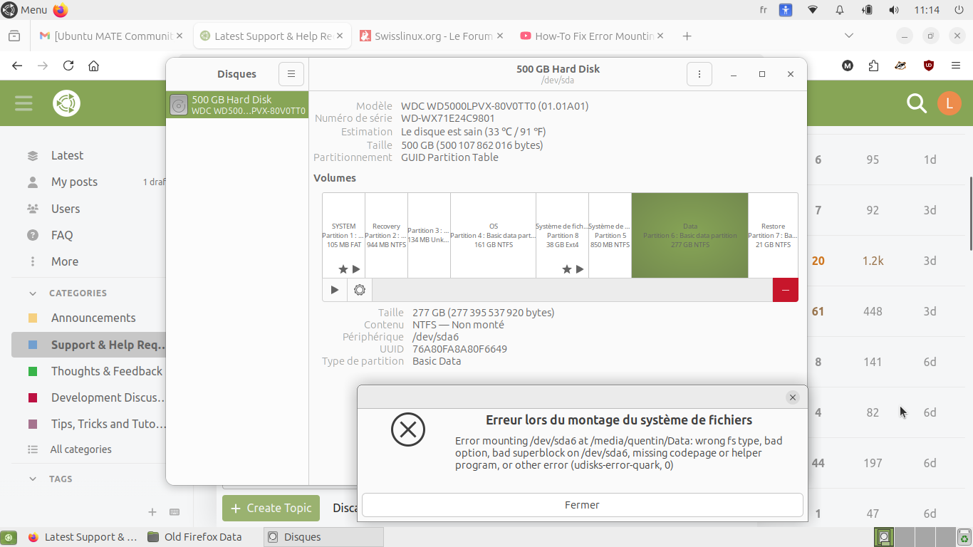 Error mounting/dev/sda6 : wrong.fs type, bad option, bad superblock on/dev/sda6,missing code page or helper program, or other error. (udisk-error-quark, 0)