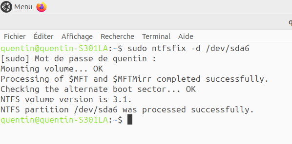 Need to adjust your partition to 4 or 6. example: sudo ntfsfix -d /dev/sda6