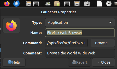 [7] Check that your launcher is actually pointing to "/bin/firefox" in the Command box: