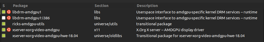 The following are the installed packages related to "amdgpu", reported by Synaptic: