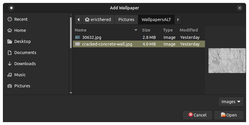 Otherwise, if you either renamed your directory from something else to My_Wallpapers, or you renamed the wallpaper file itself, the Preferences would determine the "wallpaper resource" (i.e. your previously selected wallpaper) has an invalid PATH definition (MATE working with pointers/references, not with actual files), so it automatically removes the offending reference, hence it going "poof" from the choices presented.